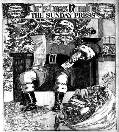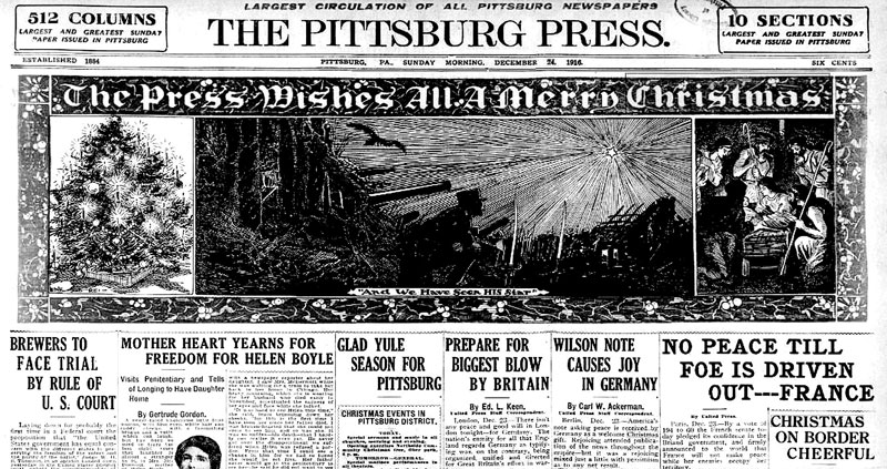 The images on these pages reveal how our area celebrated and announced the holidays in the early years of the last century. To reach back even further to start, there’s a telegraph greeting from Andrew Carnegie (in New York) wishing his Pittsburgh employees a merry Christmas—in 1890! The [Pittsburg] Sunday Press of December 18, 1910, exhibited a fine illustration of Santa checking his list for its “Christmas Number.” A very festive front page adorned the December 24, 1916, edition of the Pittsburg Press (when the spelling still omitted the H), with headlines such as “Glad Yule Season for Pittsburg” and the wartime “No Peace Till Foe Is Driven Out—France … Christmas on Border Cheerful.”