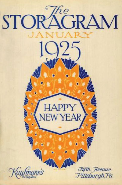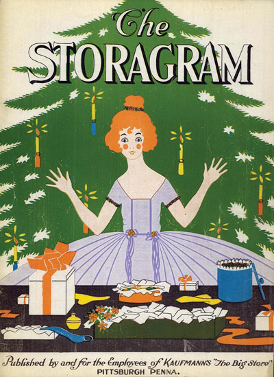 One of Kaufmann’s department store’s promotions of a century ago was a magazine called The Storagram, and we show here a copy of its holiday issue, December 1920, as well as a 1925 edition celebrating the New Year. By the late 1920s radio was king, and from the Pittsburgh (welcome back, H!) Press of December 24, 1928, we see a layout highlighting all the KDKA, WJAS, and WCAE radio programs for Christmas Eve—accompanied by photos of five broadcasting personalities (including Mayor Kline) to be “Heard in Holiday Programs.” Finally, we come across one of the fine covers for the main Pittsburgh magazine of the era (before Pittsburgh Monthly, Pittsburgh Quarterly, and of course The Strip!)—The Bulletin, with a bright red holiday cover for The Christmas Bulletin of 1926.